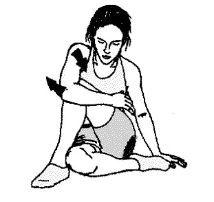 1) Vous êtes assise et vous croisez une jambe fléchie sur l’autre jambe. Ramenez le pied de la jambe supérieure vers le bassin et poussez le genou vers vous avec le bras opposé. Résistez d’abord à la pression de votre coude pendant 5 secondes puis ne résistez plus pendant 5 secondes à nouveau. Procédez de la même manière pour l’autre jambe (ça tirera là où vous avez le point noir sur la photo au niveau de la fesse).