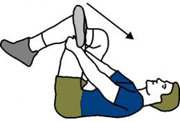 3) Pour étirer les petit, moyen, grand fessiers : allongez-vous sur le dos, croisez une jambe par dessus l’autre et tirez votre jambe vers vous. Vous mains sont derrière la cuisse ou au niveau du genou. Restez dans cette position une trentaine de secondes puis recommencer l’opération de l’autre côté. Réalisez cet étirement trois fois par jambe.