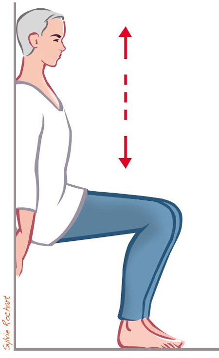 Pour cet atelier, il vous faut un mur. Collez-vous contre la paroi puis descendez en position assise. Votre corps doit former un angle droit avec le mur. Cette position fait également travailler les quadriceps, vous les sentirez bien.