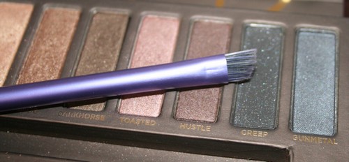 Deluxe Crease Brush: Ce pinceau est plus aplati (bien qu’il soit quand même bien fourni). J’utilise un côté pour poser les fards clairs, l’autre côté ainsi que le bout un peu pointu pour les fards foncés, sur la paupière mobile ou le creux de paupière. Il estompe assez bien lui aussi. Parfois je n’ai pas besoin d’utiliser le Base Shadow Brush.