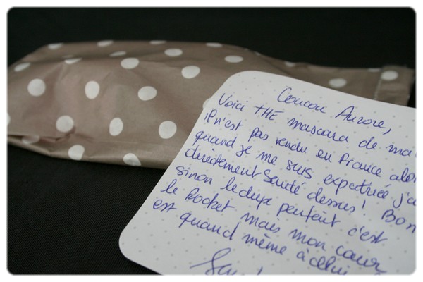 Mon cadeau a mis le temps pour arriver, nous étions toutes deux très impatientes que je le réceptionne (merci les jours fériés !). Finalement, il a débarqué dans un mignon papier à pois, avec un petit mot associé à mon intention (merci ma belle !).