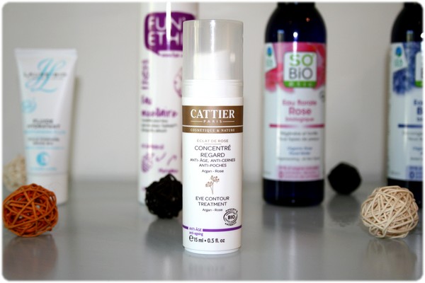 J’hydrate ma peau avec le fluide hydratant à l’huile d’amande douche bio Josiane Laure, et mon contour des yeux avec le concentré regard éclat de rose de Cattier.