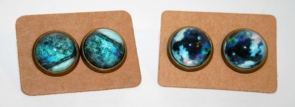J’ai shoppé deux paires de boucles d’oreilles clous que je compte porter en mix (4 euros les deux paires). Je trouve cela plus sympa. J’adore les motifs que je trouve très originaux (on se croirait dans la galaxie, ou la mer, à vous de voir !).