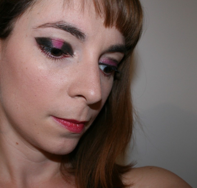Là, avec le Maquillage Graphique, ça se complique un peu plus, car on voit rappliquer d’autres paramètres. J’ai fait mes petites recherches. Souvent, le maquillage graphique s’accompagne de liner (mince), de couleurs vives (pourquoi pas) ou de formes géométriques (mouais). Pour ma part, j’ai décidé de miser sur un make up coloré, asymétrique, avec liner.