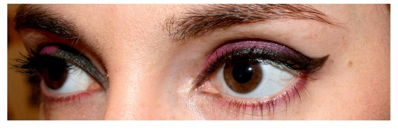 Pour l’œil gauche, j’ai opté une paupière dans les tons roses, un ras de cil de même teinte et un liner noir qui part s’estomper dans le creux de paupière.
