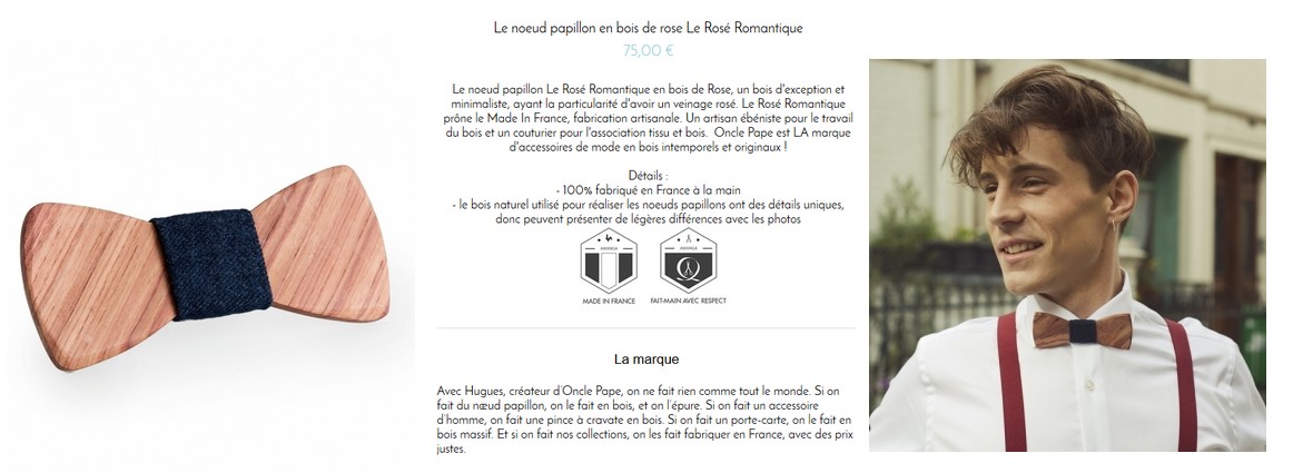 Pour terminer cette sélection, voici un accessoire qui m’a complètement intriguée. Si si, un nœud papillon en bois ! Sur le site, il y a en effet aussi bien des produits pour les femmes que pour les hommes. Je trouve cet accessoire vraiment original. Après, cela ne va peut-être pas à tout le monde mais il y a de quoi être surpris !