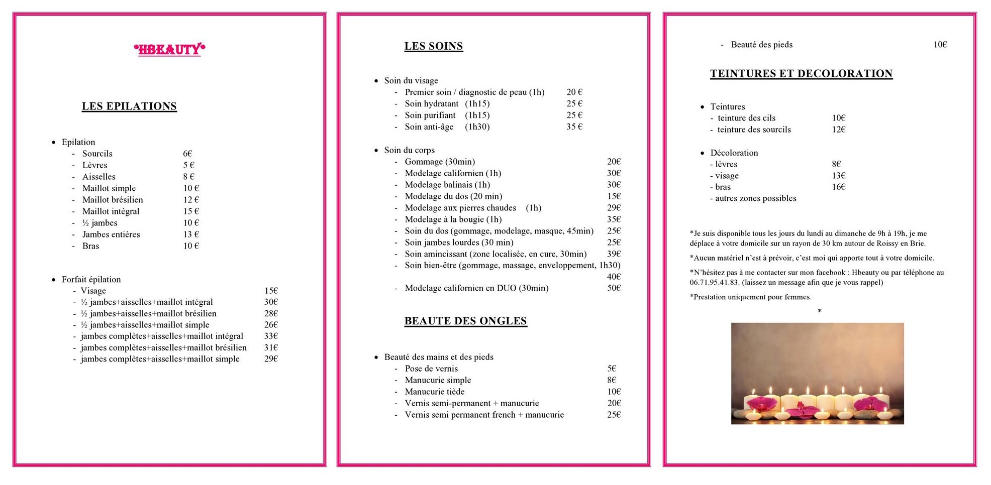 – Épilations : sourcils, lèvres, bras, jambes, maillot, aisselles.