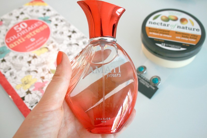 – Un parfum Amati – Evaflor (Note de tête : pamplemousse orange. Note de coeur : floral. Note de fond : vanille musc, j’ai eu l’occasion de l’offrir à une amie, il est juste parfait pour l’été).
