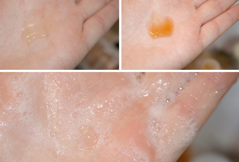Côté texture, nous avons affaire à deux produits très fluides mais pas liquides, avec des teintes qui évoquent vraiment le naturel (miel, couleurs tisane comme je dis souvent). Le shampooing traitant est un poil plus caramel et épais que le shampooing doux.