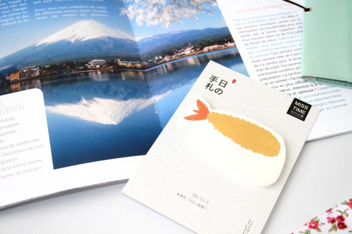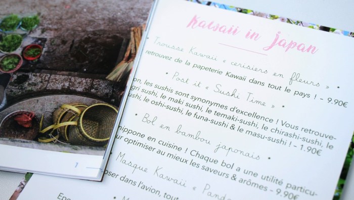 1. Waw… tant de jolies choses ! Le Japon est un pays que j’aimerais vraiment visiter ; donc tous les goodies de cette box ainsi que le livret me tenteraient bien !