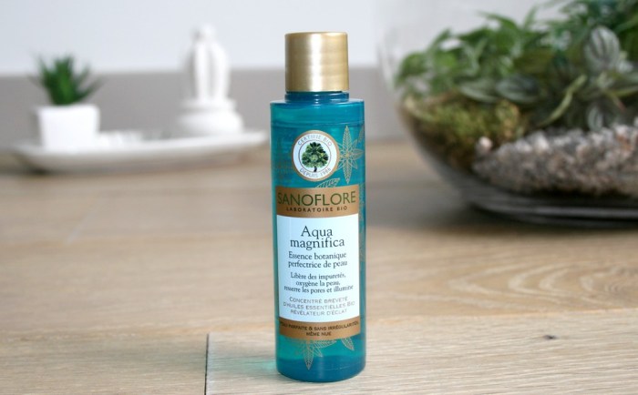 Vous saviez que ma dernière revue produit sur le blog date du mois d’avril ? C’était quand je vous avais présenté ma routine capillaire bio du moment alors ça fait loin, vraiment loin en fait. Je rattrape le coup aujourd’hui en vous donnant mon avis sur le dernier cosmétique bio que j’ai testé. Il y a environ un mois et demi, on m’a offert une miniature de l’Aqua Magnifica – Essence Botanique Perfectrice de Peau de Sanoflore (merci papa !). Comme je viens de la terminer, je me suis dit que j’allais en profiter pour vous en parler sur le blog. Ce n’est pas le premier produit de cette marque que j’utilise. J’avais déjà testé l’eau micellaire Aciana Botanica que je n’avais pas aimée du tout. Je vous en parlais brièvement dans mon article sur la blog box Pharmashopi. Si j’avais été ravie de la recevoir, j’avais vite déchanté à l’utilisation. Elle me piquait atrocement les yeux lors du démaquillage et je devais utiliser deux produits différents pour y palier. C’était par ailleurs un cosmétique qui sentait très fort. Je n’avais pas trouvé cela agréable pour le visage. J’aime les parfums plus doux. Bref, du coup, j’avoue que j’appréhendais un peu l’utilisation de ce nouveau produit à cause de cette expérience avec l’eau micellaire.