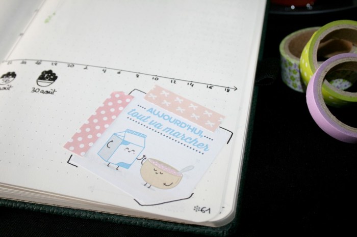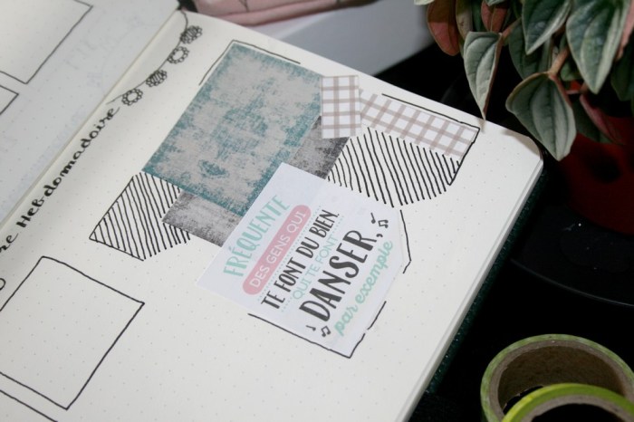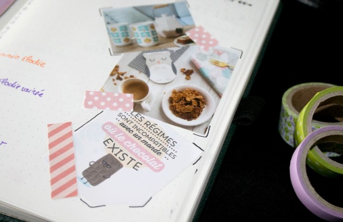 Pour la page de droite, calendrier du mois pour les info générales et rappel cocooning avec un assemblage de petites douceurs et un clin d’oeil au « régime » que j’ai démarré il y a quelques semaines (un article arrive aussi mais plus tard, j’ai encore besoin de temps les loulous). Pour égayer tout ça, j’ai découpé des marques pages. Ça fait office de masking tape, j’aime bien l’effet, et comme je n’ai que trois rouleaux pour l’instant, ça fait bien le job.