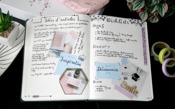 Je passe maintenant à mes deux pages préférées sur ce mois de septembre : mes idées d’articles et mes wishlists. Je vous avoue que je ne suis pas peu fière du petit taf réalisé ici. Ce sont les pages sur lesquelles je me suis le plus éclatée. J’ai trouvé de jolies photos dans le mag Maisons du Monde et je les ai associées à des stickers et des bouts de papier découpés dans mon journal Mr Wonderful. Je l’avais shoppé en septembre dernier mais je n’avais pas réussi à être régulière et je l’avais très vite abandonné malgré la qualité du carnet. Enfin, le positif c’est que j’ai à la disposition plein d’élément de déco pour mon bujo.