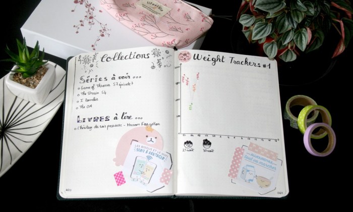 Les deux pages suivantes sont réservées à mes collections séries et livres ainsi qu’à mon weight tracker (calories et poids). D’ici à ce que je publie cet article, j’aurai bien évidemment terminé Game of Thrones mais pour les autres, cette petite collection va m’aider à me booster un peu car j’ai plein de choses à voir !