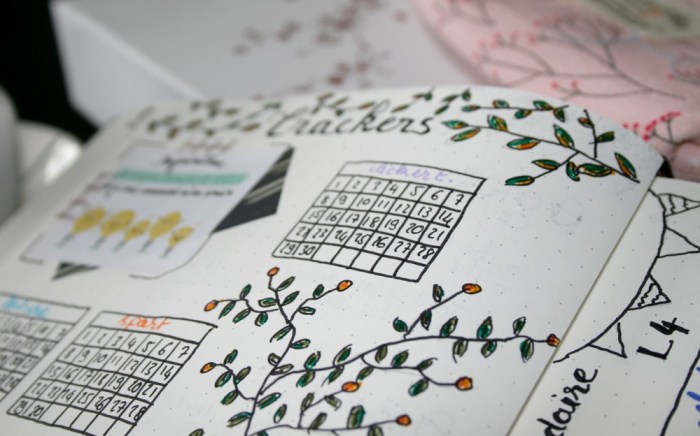 La petite dernière vraiment illustrée avec mes autres trackers : clicker training, lecture, sport, ménage et les trackers liés au blog et à mes réseaux sociaux. J’ai choisi un motif de feuilles aux couleurs un peu automnales ici et un petit arbre avec des baies. Cela reste très simple histoire de ne pas trop déraper quand même. Je ferai davantage la fofolle quand j’aurai un peu plus de dextérité au stylo.