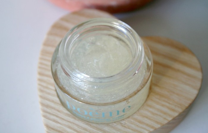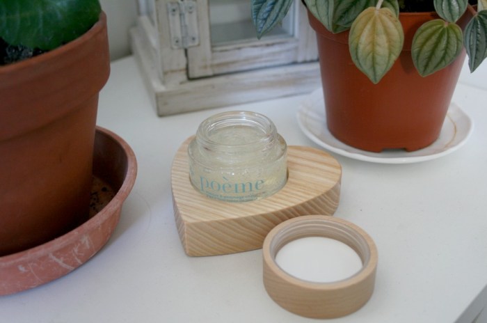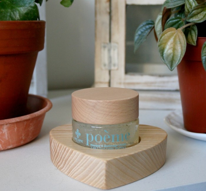 L’un des gros points forts de la marque : les packagings ! Tout comme le reste de la gamme, Poème est proposé dans un emballage vraiment canon. Il est présenté dans un pot en verre que l’on peut réutiliser une fois terminé. Il est surmonté d’un petit opercule en plastique recyclable pour protéger le gommage de l’humidité (je rappelle qu’il se modifie au contact de l’eau). Un couvercle en bois de hêtre ferme le tout. On peut poser le pot sur un joli cœur en bois pour le ranger. Je suis conquise.