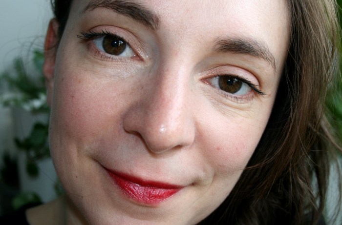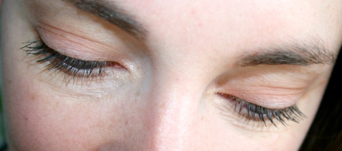 Qu’est-ce que ça donne après application d’une couche ? Je crois qu’on peut dire que côté volume le pari est tenu. On voit vraiment la différence entre avec et sans le mascara. Par contre pour la recourbure, ce n’est pas foufou avec une couche, on obtient mieux avec deux. Dernière chose, et c’est le petit défaut que je trouve à ce produit : il a tendance à faire des paquets et à ne pas assez séparer les cils à mon goût. Mais on va dire que je m’en accommode. La tenue est excellente. Attention au temps de séchage. Évitez de toucher vos cils trop vite après l’application, sinon vous en mettrez partout.