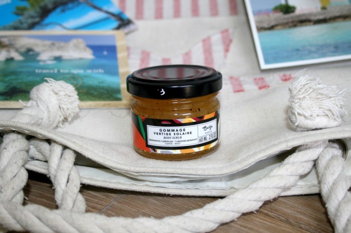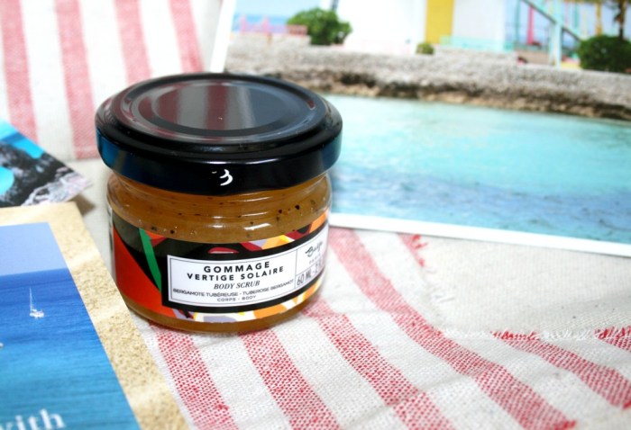 Mais recentrons-nous plutôt sur notre petit soin corporel du jour. Je ne sais pas vous, mais je suis une grosse fan des odeurs plutôt fruitées et tirant sur les senteurs d’agrumes ou exotiques. J’avais adoré la gamme Moana par exemple, qui était un vrai délice. Vertige solaire est proposé dans un pot en verre de 60 ml avec une base transparente et un couvercle noir. J’aime beaucoup ce packaging qui laisse voir la quantité de gommage qu’il reste dans le pot, c’est plus pratique que les tubes à ce niveau.