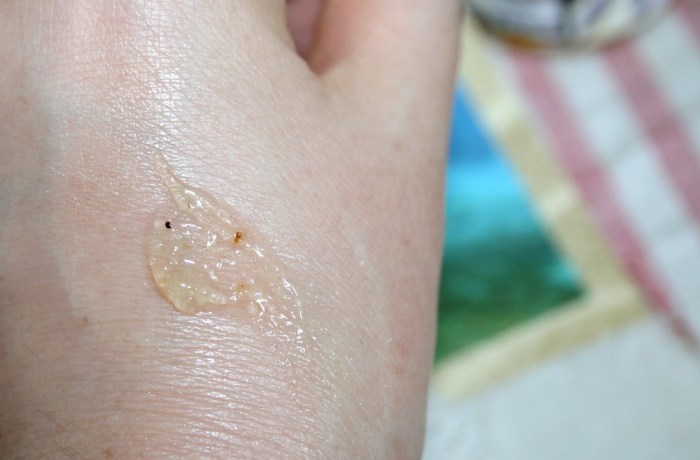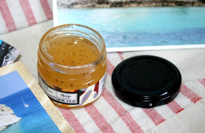 Le produit se présente sous la forme d’une gelée, contrairement au gommage Moana qui était biphasé (une partie huile, une partie gommage) et qu’il fallait mélanger avant application. Il contient de l’Eau d’Hamamélis, des Grains de sucre, des Pépins de Fruits de la passion exfoliants et de l’Huile Végétale et il laisse sur la peau un parfum de Bergamote et de Tubéreuse.