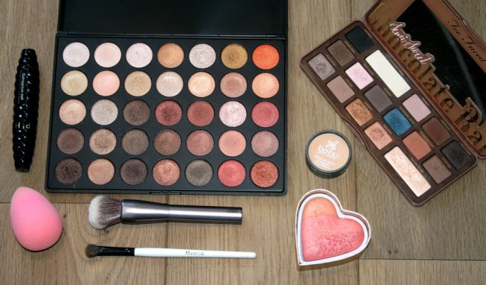Pour le tutoriel d’aujourd’hui, je vais donc me concentrer sur le maquillage des yeux. Je pense que je vous ferai prochainement un article sur ma routine teint du moment mais chaque chose en son temps (j’ai tellement d’idées en ce moment que j’ai du mal vous programmer tout ça…). Pour ce makeup, j’ai décidé d’utiliser deux palettes que j’aime beaucoup : la 35OS de Morphe Brushes et la Semi Sweet Chocolate Bar de Too Faced. Le choix de deux au lieu d’une est tout simple. Je n’aime pas appliquer des fards autres que mattes en première intention en creux de paupière. Et, malheureusement, la 35OS ne contient aucun fard mat ! La Semi Sweet était le choix qui s’imposait vu les teintes que j’avais choisies sur la 35OS ;). Mais trêve de bavardages. On passe au tuto ? C’est parti !