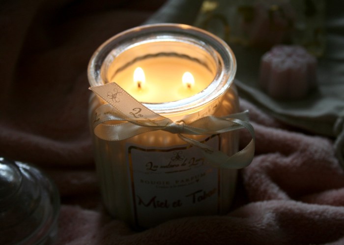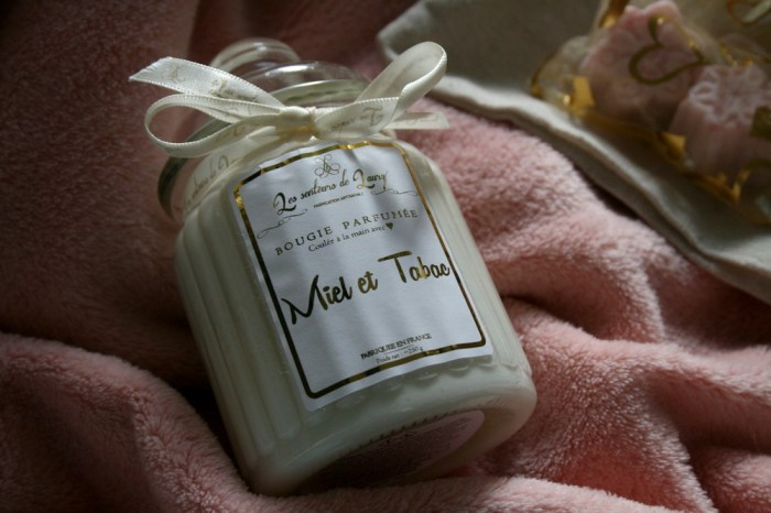 Pour Noël cette année, j’avais glissé dans ma liste plusieurs petits produits Les Senteurs de Laury. Mon beau-frère et sa chérie m’ont offert une jolie bonbonnière parfum Miel et Tabac, un vrai délice gourmand. Je l’utilise tous les soirs quand je vais me doucher. Disons que c’est ma pause détente de fin de journée. C’est quelque chose que j’adore faire. Le contenant en verre est très joli. Transparent, plutôt simple et agrémenté d’un petit ruban à la base du « bouchon ». Elle possède deux mèches pour l’allumage, 100% lin. La senteur se diffuse rapidement. C’est parfait pour une pièce comme une salle de bain ou une chambre.