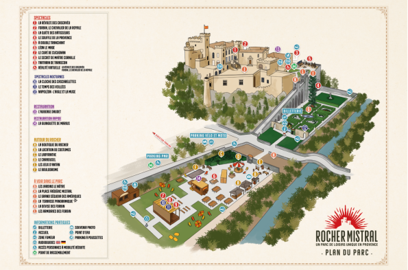 Construit sur un éperon rocheux, ce château médiéval ressemble à un décor tout droit sorti d’un film de cape et d’épée. Parmi ses murs, on s’imagine en princesse ou en chevalier… Le Rocher Mistral propose des spectacles toute la journée pour petits et grands. En ce qui nous concerne, nous n’avons pas vu les animations extérieures. Il faisait trop chaud pour Chloé (40°C avec la varicelle, pas top). Nous leur avons préféré la petite balade à l’intérieur parmi les décors d’époque. Nous y avons vu une rétrospective de l’attaque du château par les Cascavéous en 1630.